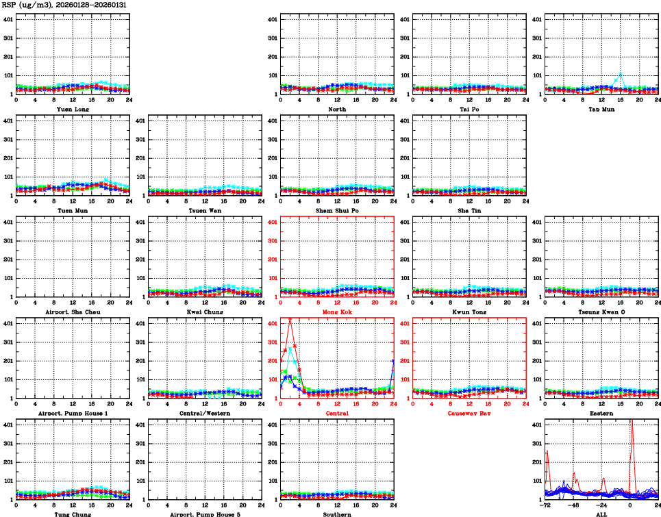 | Air Quality Data Time Series for RSP (2026/01/31) | ( Line colors: Day -3 Day -2 Day -1 Current day ) | 2D Map Current AQHI |