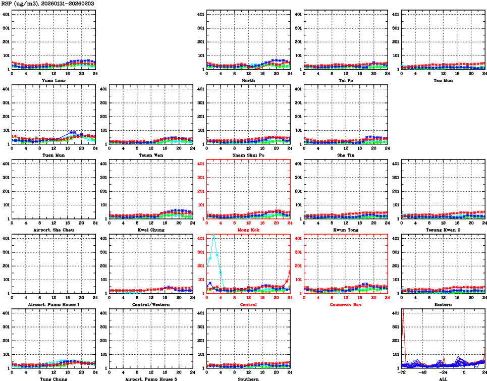 | Air Quality Data Time Series for RSP (2026/02/03) | ( Line colors: Day -3 Day -2 Day -1 Current day ) | 2D Map Current AQHI |