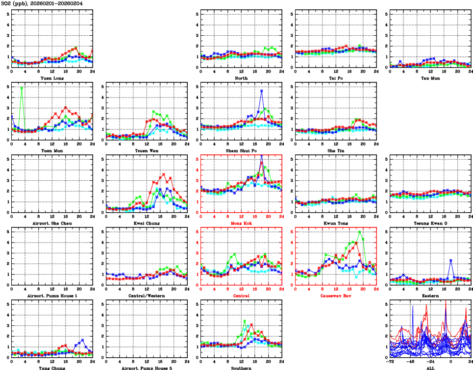 | Air Quality Data Time Series for SO2 (2026/02/04) | ( Line colors: Day -3 Day -2 Day -1 Current day ) | 2D Map Current AQHI |
