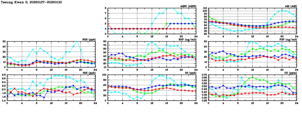 | Air Quality Data Time Series in Tseung Kwan O (2026/01/30) | ( Line colors: Day -3 Day -2 Day -1 Current day ) | 2D Map Current AQHI |