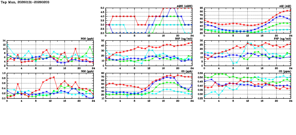 | Air Quality Data Time Series in Tap Mun (2026/02/03) | ( Line colors: Day -3 Day -2 Day -1 Current day ) | 2D Map Current AQHI |