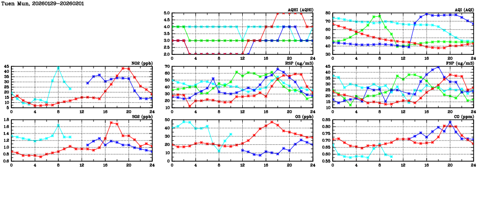 | Parameters: | AQHI | AQI | RSP | FSP | NO2 | SO2 | O3 | CO | Temp | WS | WD |