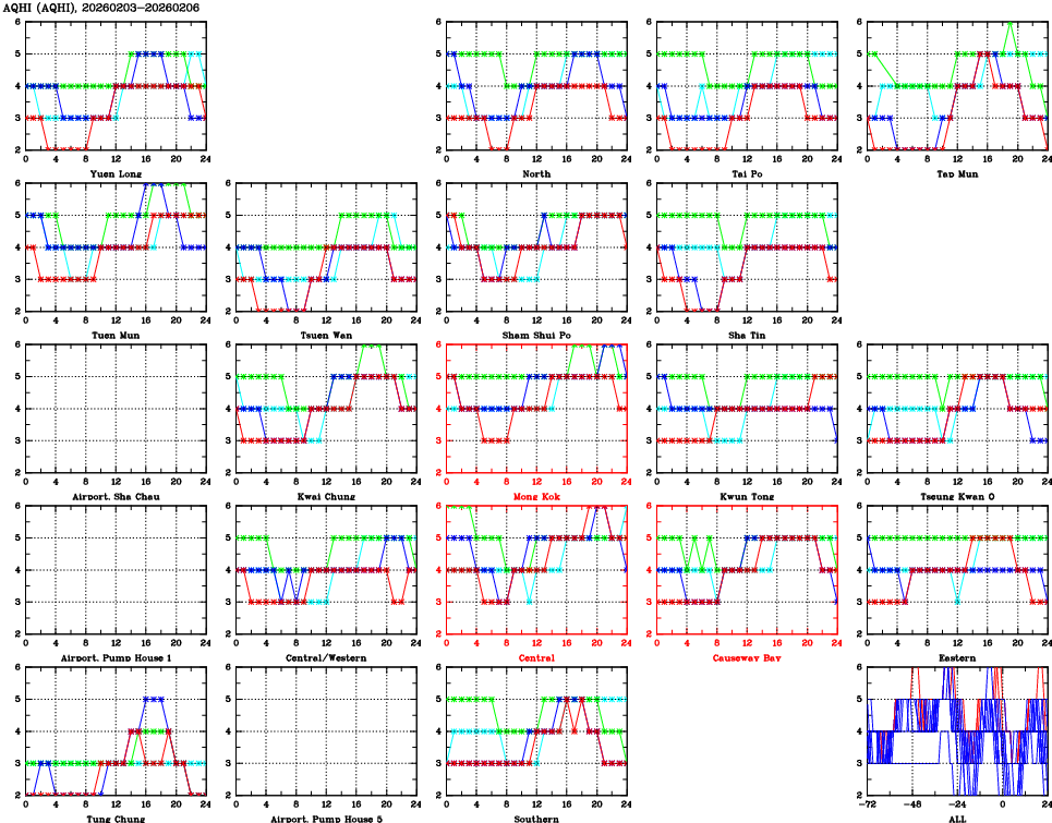 | Air Quality Data Time Series for AQHI (2026/02/06) | ( Line colors: Day -3 Day -2 Day -1 Current day ) | 2D Map Current AQHI |