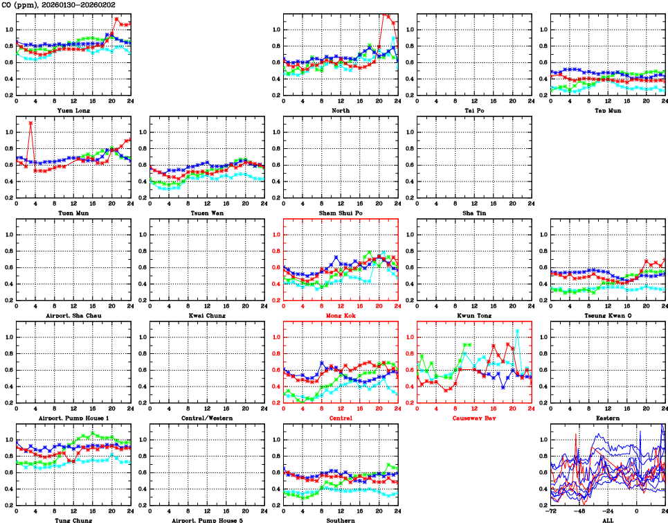 | Air Quality Data Time Series for CO (2026/02/02) | ( Line colors: Day -3 Day -2 Day -1 Current day ) | 2D Map Current AQHI |