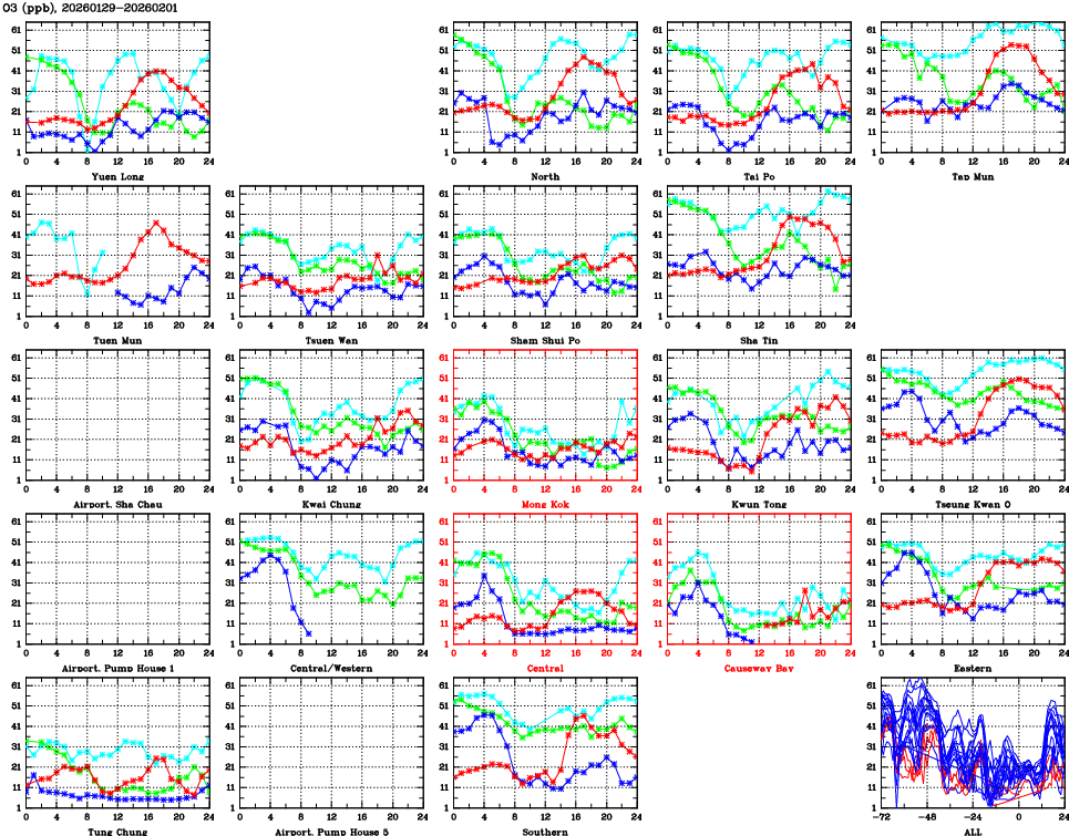 | Air Quality Data Time Series for O3 (2026/02/01) | ( Line colors: Day -3 Day -2 Day -1 Current day ) | 2D Map Current AQHI |