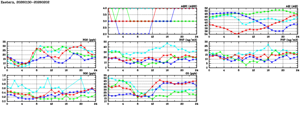 | Air Quality Data Time Series in Eastern (2026/02/02) | ( Line colors: Day -3 Day -2 Day -1 Current day ) | 2D Map Current AQHI |