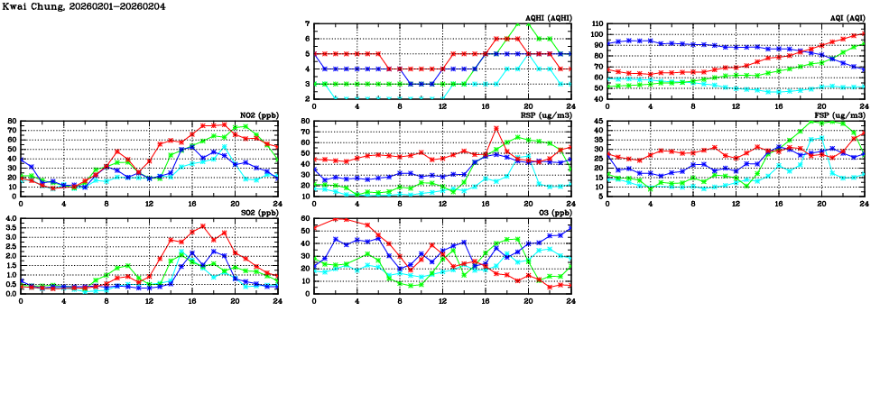 | Air Quality Data Time Series in Kwai Chung (2026/02/04) | ( Line colors: Day -3 Day -2 Day -1 Current day ) | 2D Map Current AQHI |