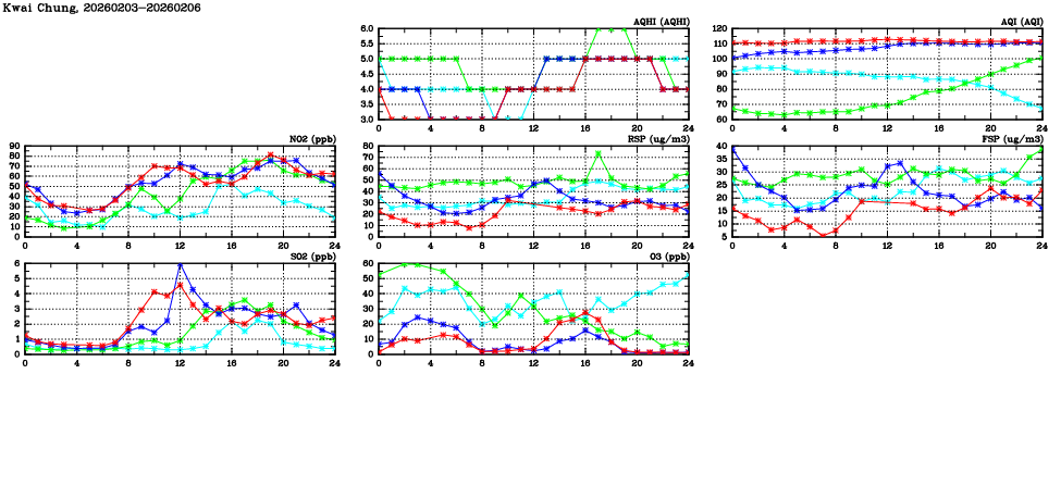 | Air Quality Data Time Series in Kwai Chung (2026/02/06) | ( Line colors: Day -3 Day -2 Day -1 Current day ) | 2D Map Current AQHI |