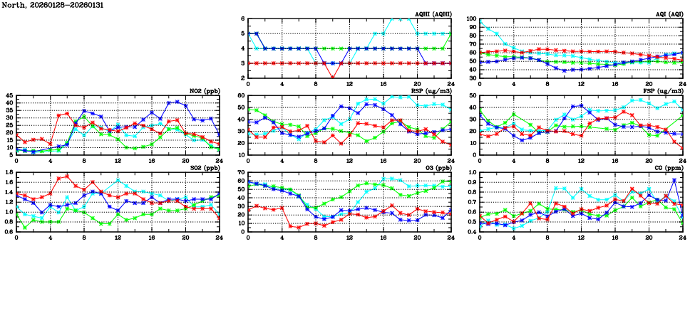 | Air Quality Data Time Series in North (2026/01/31) | ( Line colors: Day -3 Day -2 Day -1 Current day ) | 2D Map Current AQHI |
