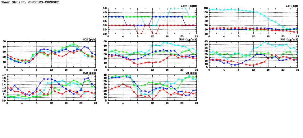 | Air Quality Data Time Series in Sham Shui Po (2026/01/31) | ( Line colors: Day -3 Day -2 Day -1 Current day ) | 2D Map Current AQHI |