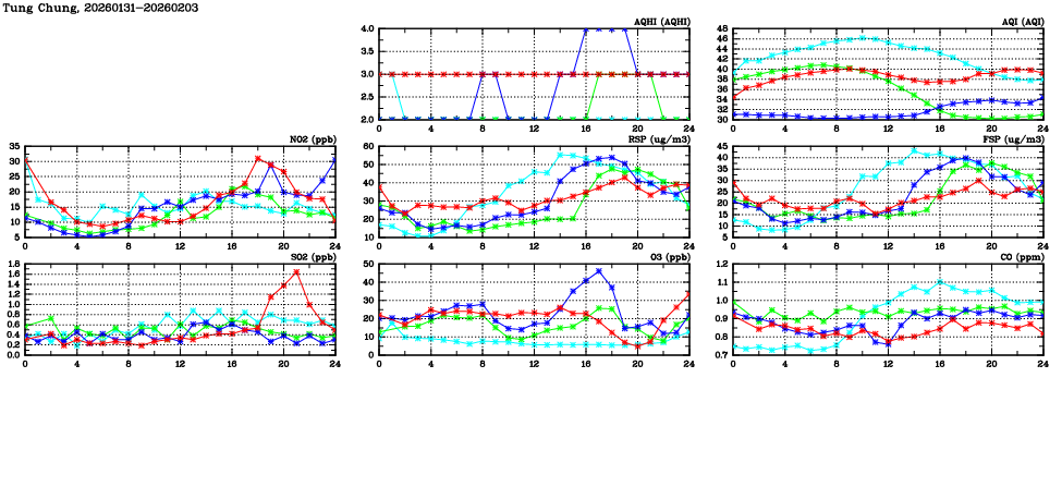 | Air Quality Data Time Series in Tung Chung (2026/02/03) | ( Line colors: Day -3 Day -2 Day -1 Current day ) | 2D Map Current AQHI |