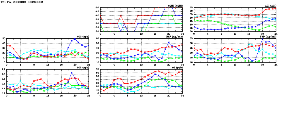 | Air Quality Data Time Series in Tai Po (2026/02/03) | ( Line colors: Day -3 Day -2 Day -1 Current day ) | 2D Map Current AQHI |