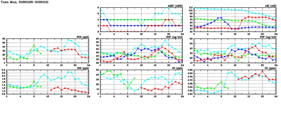| Air Quality Data Time Series in Tuen Mun (2026/01/31) | ( Line colors: Day -3 Day -2 Day -1 Current day ) | 2D Map Current AQHI |