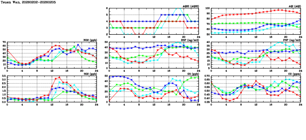 | Air Quality Data Time Series in Tsuen Wan (2026/02/05) | ( Line colors: Day -3 Day -2 Day -1 Current day ) | 2D Map Current AQHI |