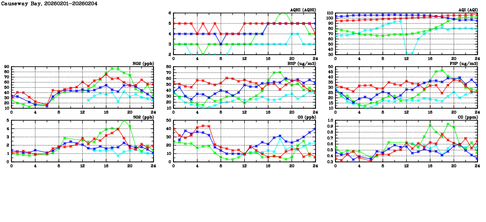 | Air Quality Data Time Series in Causeway Bay (2026/02/04) | ( Line colors: Day -3 Day -2 Day -1 Current day ) | 2D Map Current AQHI |