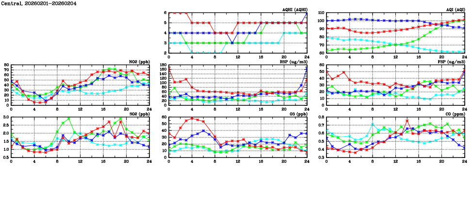 | Air Quality Data Time Series in Central (2026/02/04) | ( Line colors: Day -3 Day -2 Day -1 Current day ) | 2D Map Current AQHI |