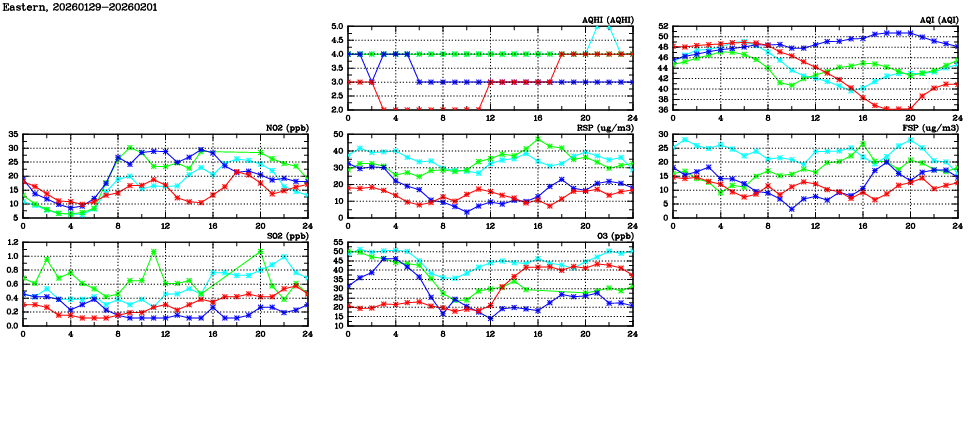 | Air Quality Data Time Series in Eastern (2026/02/01) | ( Line colors: Day -3 Day -2 Day -1 Current day ) | 2D Map Current AQHI |