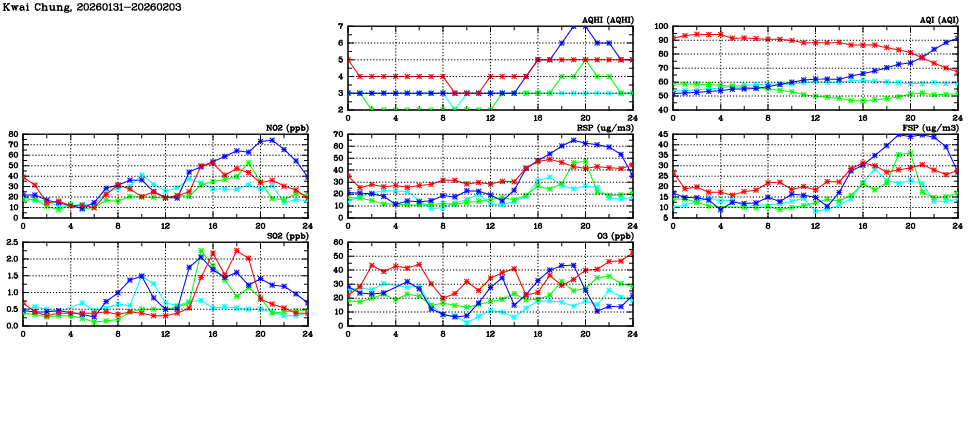 | Air Quality Data Time Series in Kwai Chung (2026/02/03) | ( Line colors: Day -3 Day -2 Day -1 Current day ) | 2D Map Current AQHI |