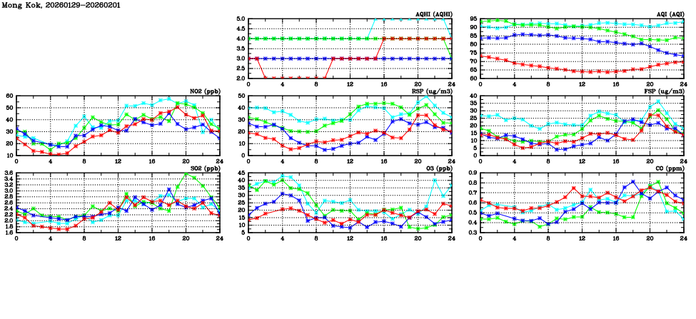 | Air Quality Data Time Series in Mong Kok (2026/02/01) | ( Line colors: Day -3 Day -2 Day -1 Current day ) | 2D Map Current AQHI |