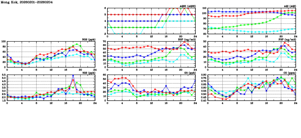 | Air Quality Data Time Series in Mong Kok (2026/02/04) | ( Line colors: Day -3 Day -2 Day -1 Current day ) | 2D Map Current AQHI |