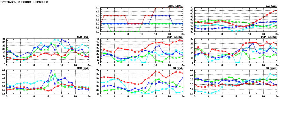 | Air Quality Data Time Series in Southern (2026/02/03) | ( Line colors: Day -3 Day -2 Day -1 Current day ) | 2D Map Current AQHI |