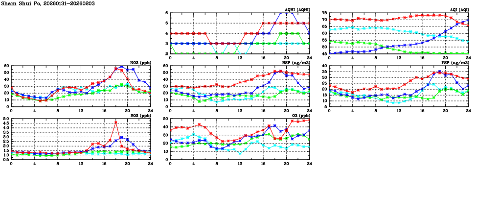 | Air Quality Data Time Series in Sham Shui Po (2026/02/03) | ( Line colors: Day -3 Day -2 Day -1 Current day ) | 2D Map Current AQHI |