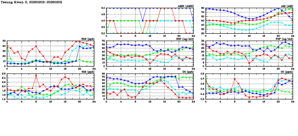 | Air Quality Data Time Series in Tseung Kwan O (2026/02/05) | ( Line colors: Day -3 Day -2 Day -1 Current day ) | 2D Map Current AQHI |