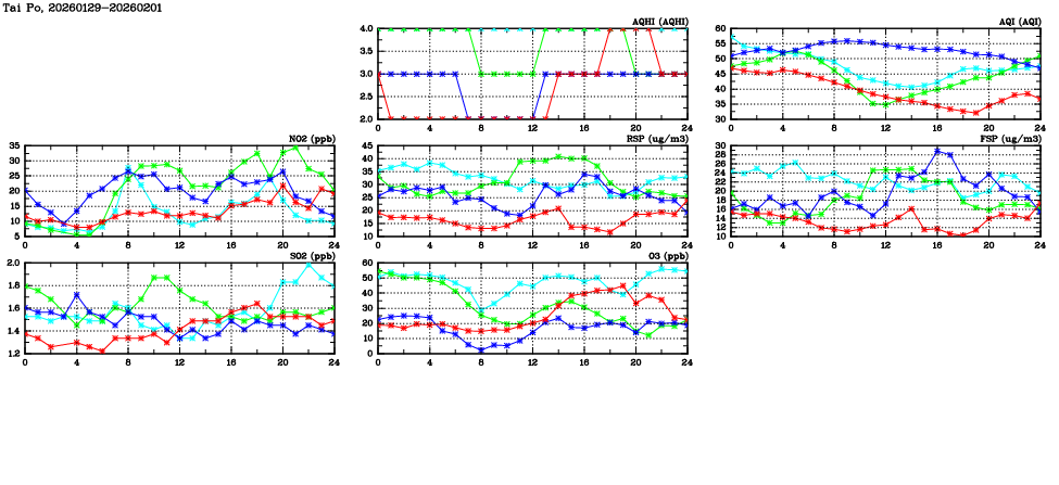 | Air Quality Data Time Series in Tai Po (2026/02/01) | ( Line colors: Day -3 Day -2 Day -1 Current day ) | 2D Map Current AQHI |