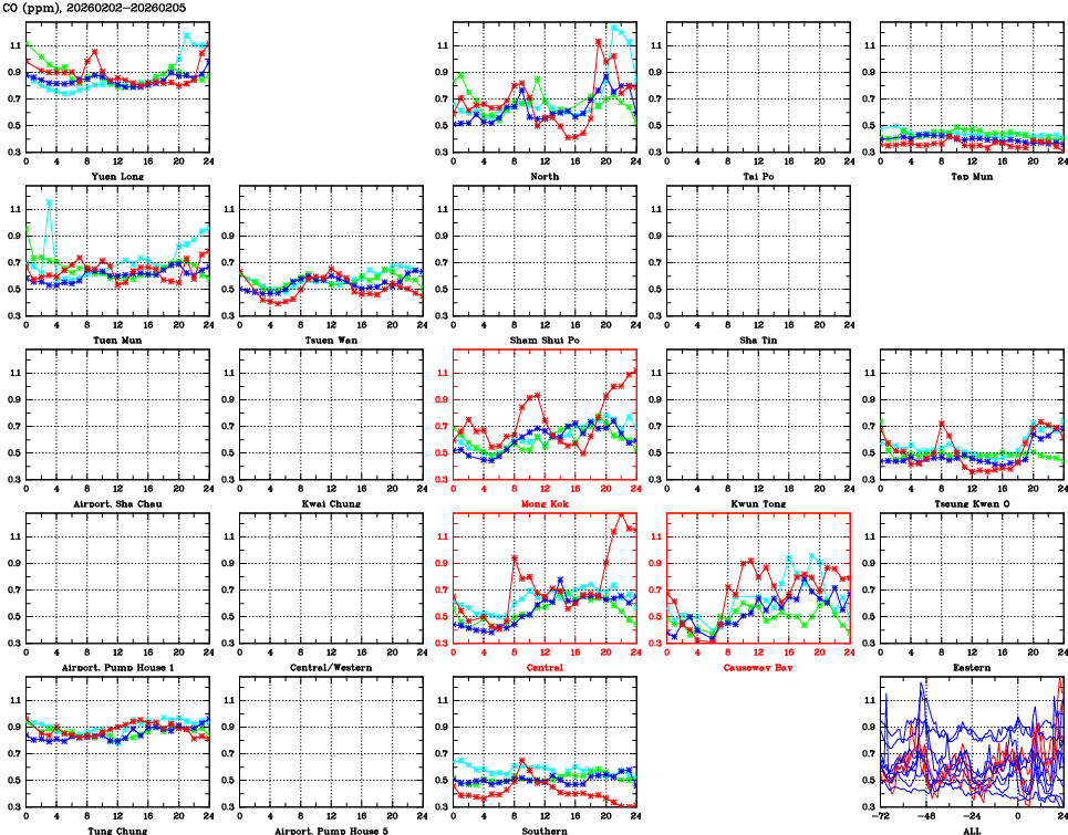 | Air Quality Data Time Series for CO (2026/02/05) | ( Line colors: Day -3 Day -2 Day -1 Current day ) | 2D Map Current AQHI |