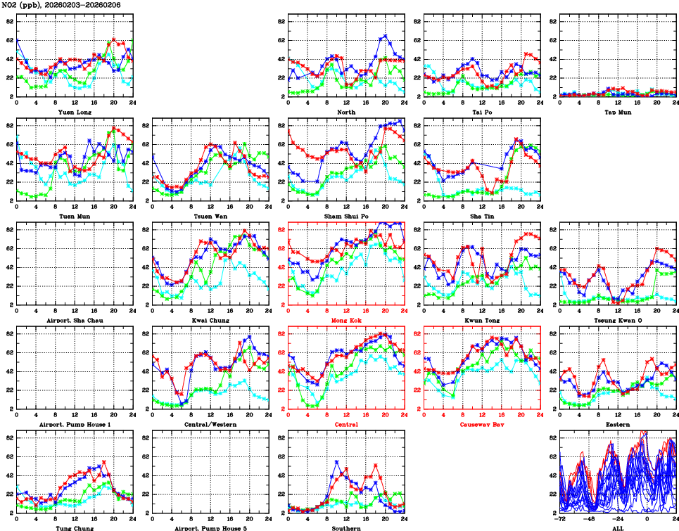 | Air Quality Data Time Series for NO2 (2026/02/06) | ( Line colors: Day -3 Day -2 Day -1 Current day ) | 2D Map Current AQHI |