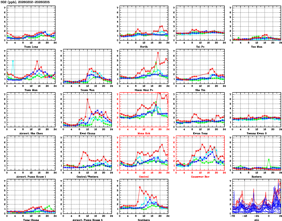 | Air Quality Data Time Series for SO2 (2026/02/05) | ( Line colors: Day -3 Day -2 Day -1 Current day ) | 2D Map Current AQHI |