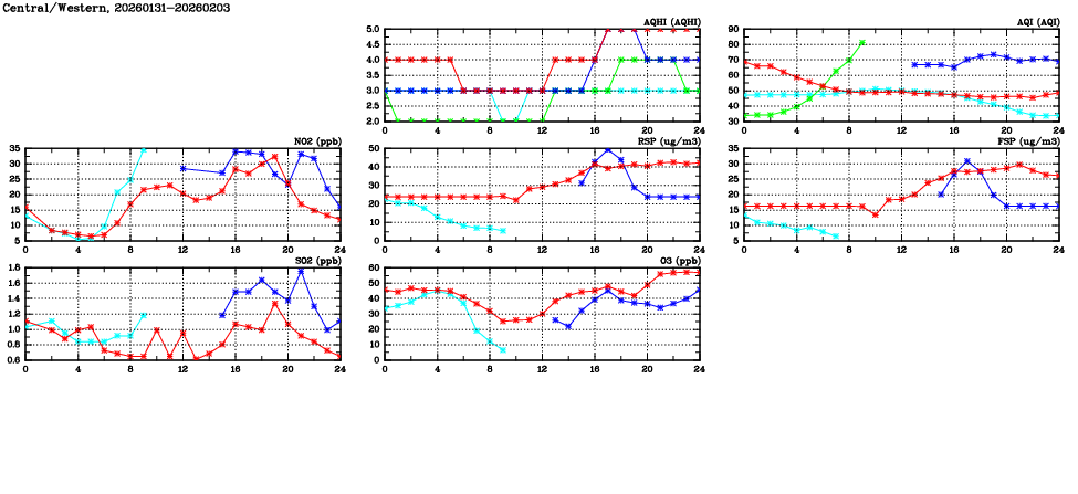 | Air Quality Data Time Series in Central/Western (2026/02/03) | ( Line colors: Day -3 Day -2 Day -1 Current day ) | 2D Map Current AQHI |