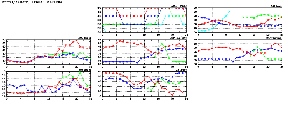 | Air Quality Data Time Series in Central/Western (2026/02/04) | ( Line colors: Day -3 Day -2 Day -1 Current day ) | 2D Map Current AQHI |