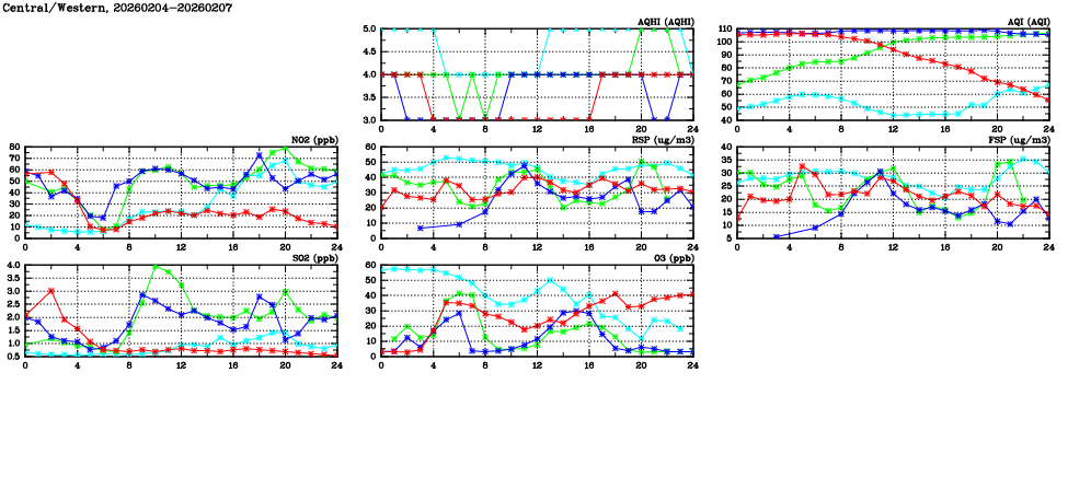 | Air Quality Data Time Series in Central/Western (2026/02/07) | ( Line colors: Day -3 Day -2 Day -1 Current day ) | 2D Map Current AQHI |