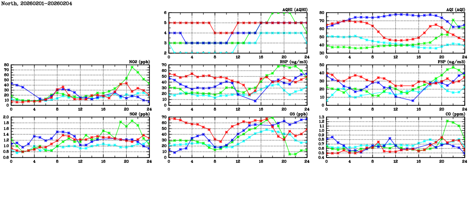 | Air Quality Data Time Series in North (2026/02/04) | ( Line colors: Day -3 Day -2 Day -1 Current day ) | 2D Map Current AQHI |