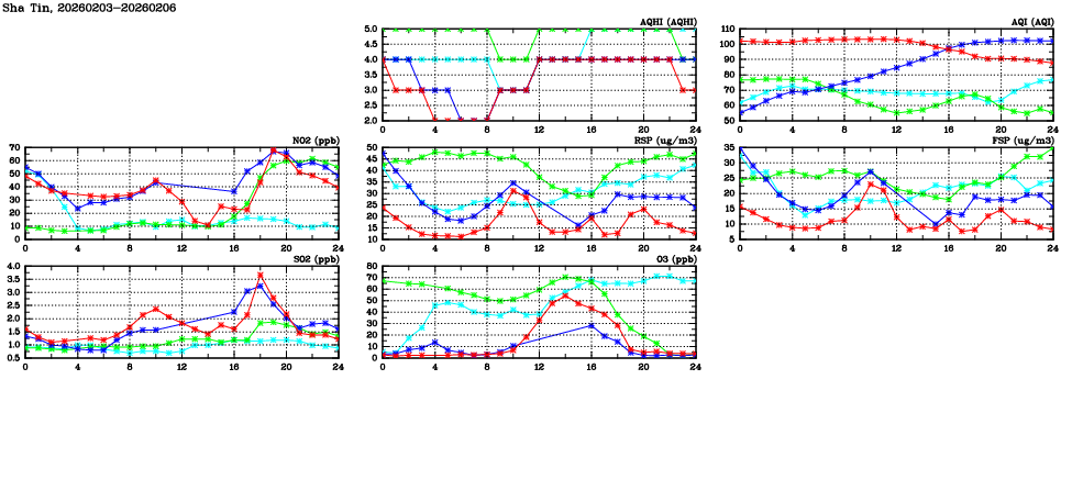 | Air Quality Data Time Series in Sha Tin (2026/02/06) | ( Line colors: Day -3 Day -2 Day -1 Current day ) | 2D Map Current AQHI |