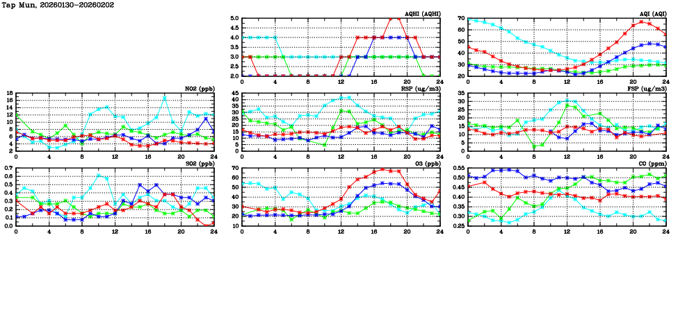| Air Quality Data Time Series in Tap Mun (2026/02/02) | ( Line colors: Day -3 Day -2 Day -1 Current day ) | 2D Map Current AQHI |