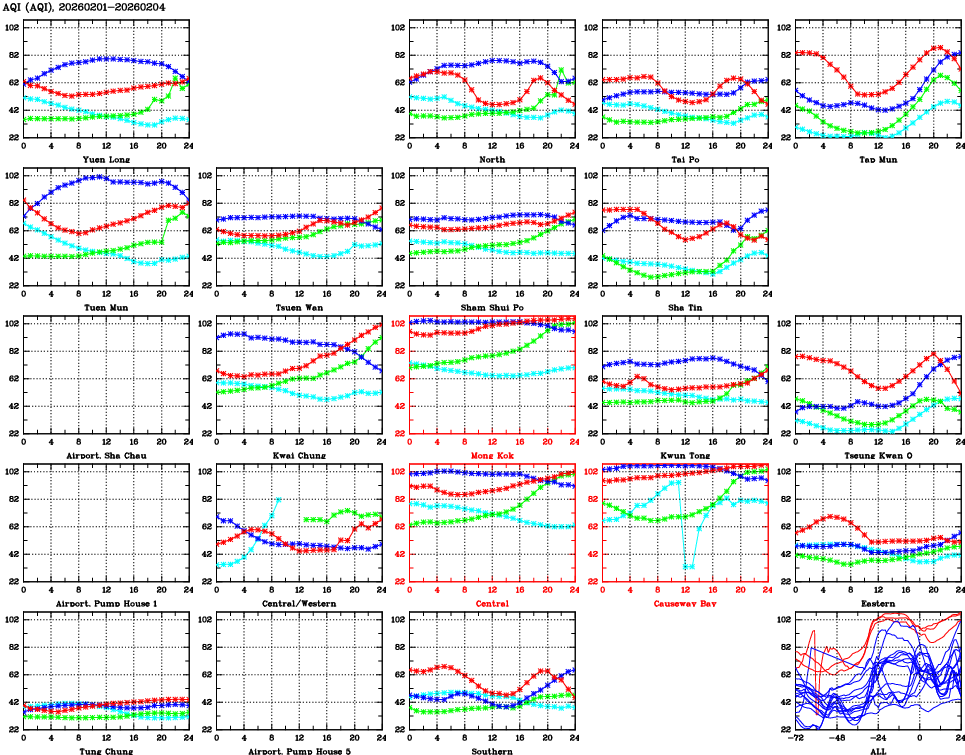 | Air Quality Data Time Series for AQI (2026/02/04) | ( Line colors: Day -3 Day -2 Day -1 Current day ) | 2D Map Current AQHI |