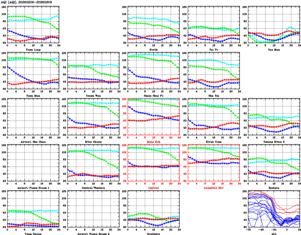 | Air Quality Data Time Series for AQI (2026/02/09) | ( Line colors: Day -3 Day -2 Day -1 Current day ) | 2D Map Current AQHI |
