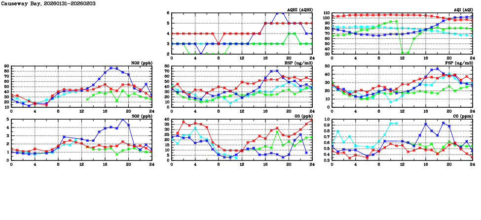 | Air Quality Data Time Series in Causeway Bay (2026/02/03) | ( Line colors: Day -3 Day -2 Day -1 Current day ) | 2D Map Current AQHI |