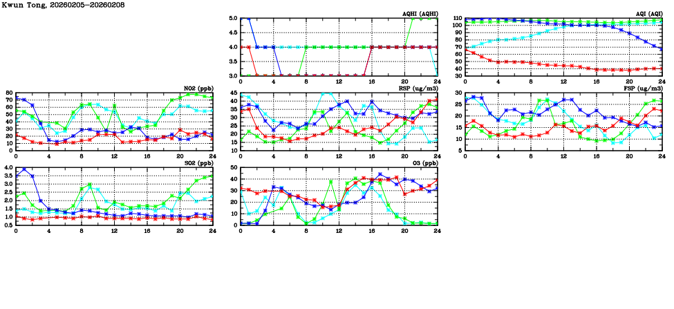 | Air Quality Data Time Series in Kwun Tong (2026/02/08) | ( Line colors: Day -3 Day -2 Day -1 Current day ) | 2D Map Current AQHI |