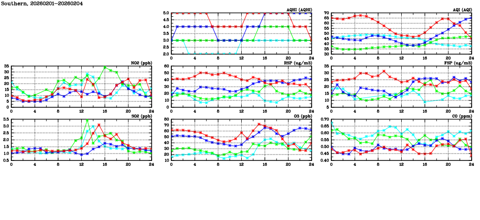 | Air Quality Data Time Series in Southern (2026/02/04) | ( Line colors: Day -3 Day -2 Day -1 Current day ) | 2D Map Current AQHI |