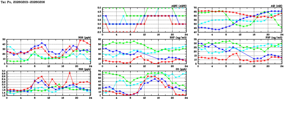 | Air Quality Data Time Series in Tai Po (2026/02/06) | ( Line colors: Day -3 Day -2 Day -1 Current day ) | 2D Map Current AQHI |