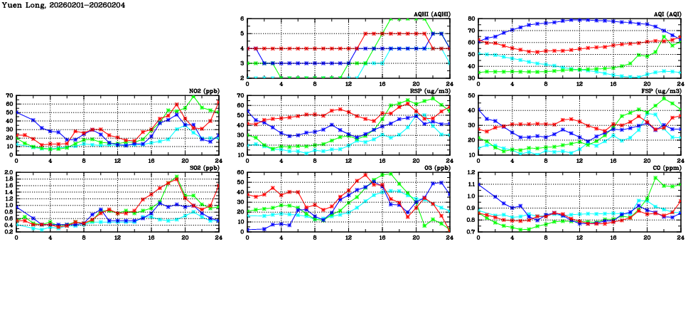 | Air Quality Data Time Series in Yuen Long (2026/02/04) | ( Line colors: Day -3 Day -2 Day -1 Current day ) | 2D Map Current AQHI |
