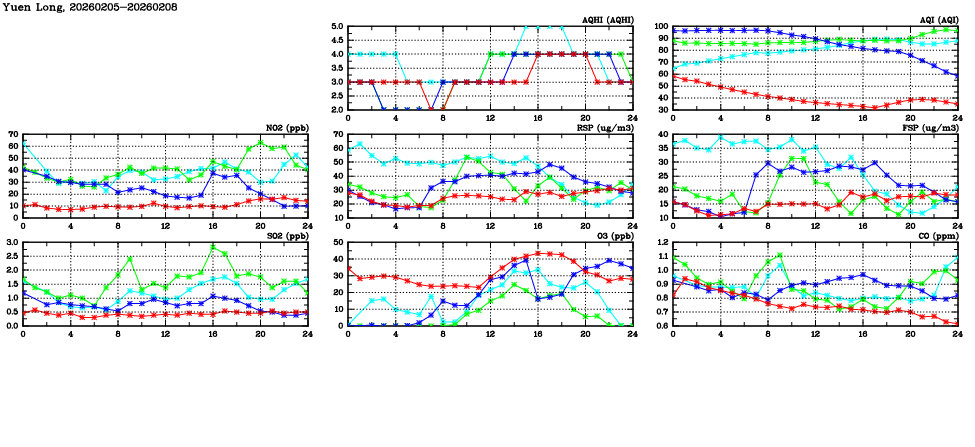 | Air Quality Data Time Series in Yuen Long (2026/02/08) | ( Line colors: Day -3 Day -2 Day -1 Current day ) | 2D Map Current AQHI |