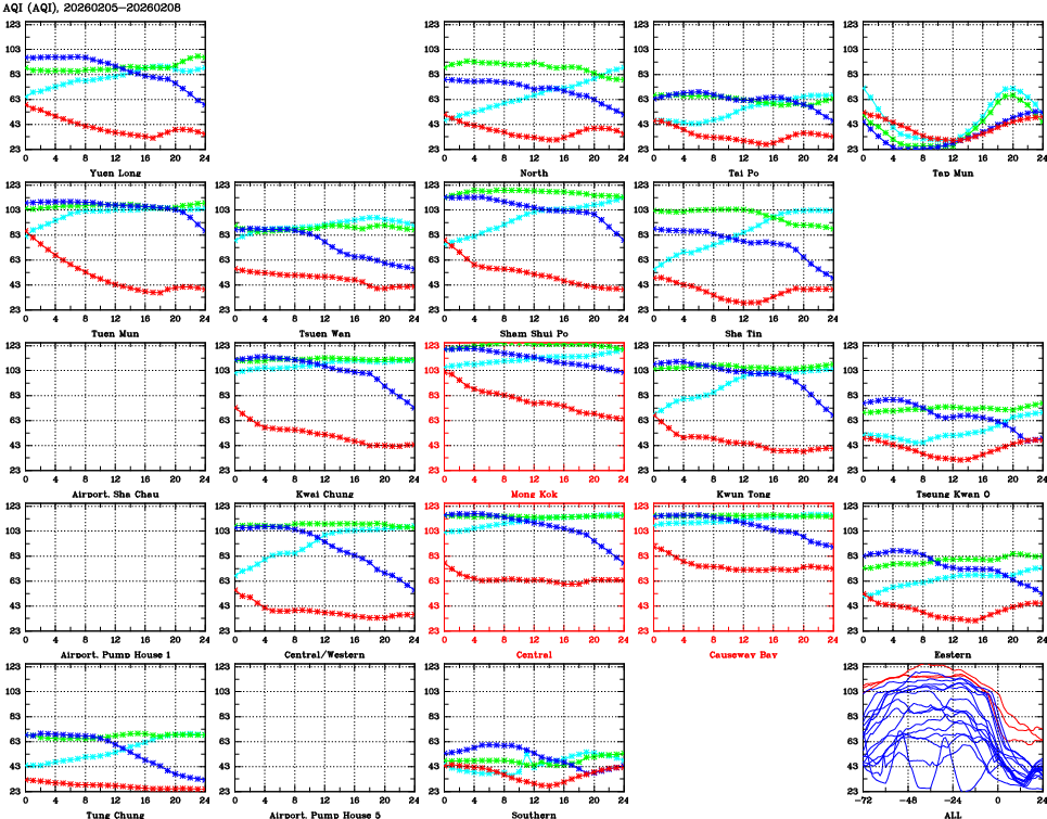 | Air Quality Data Time Series for AQI (2026/02/08) | ( Line colors: Day -3 Day -2 Day -1 Current day ) | 2D Map Current AQHI |