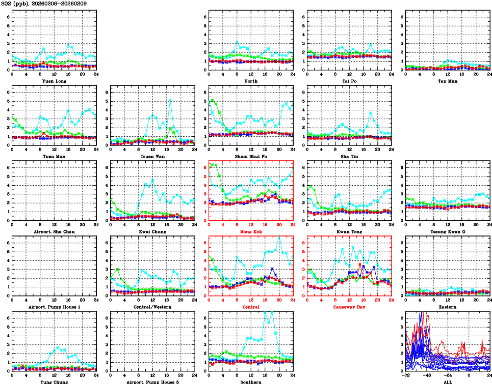 | Air Quality Data Time Series for SO2 (2026/02/09) | ( Line colors: Day -3 Day -2 Day -1 Current day ) | 2D Map Current AQHI |