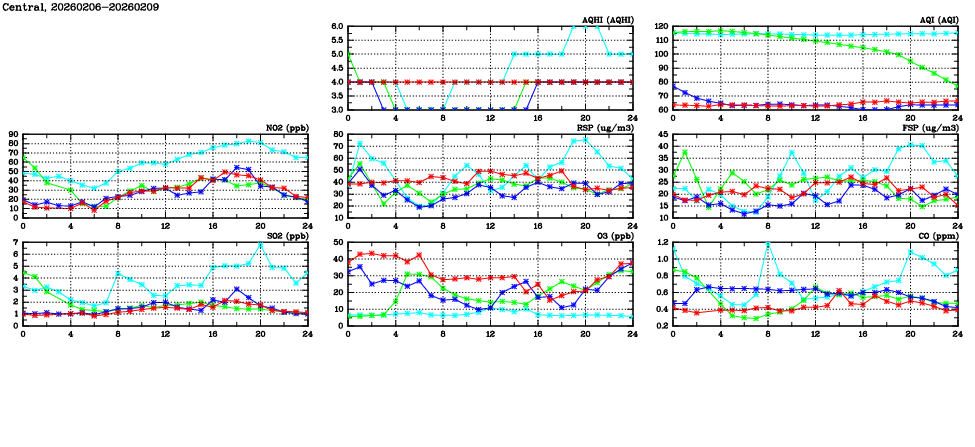 | Air Quality Data Time Series in Central (2026/02/09) | ( Line colors: Day -3 Day -2 Day -1 Current day ) | 2D Map Current AQHI |