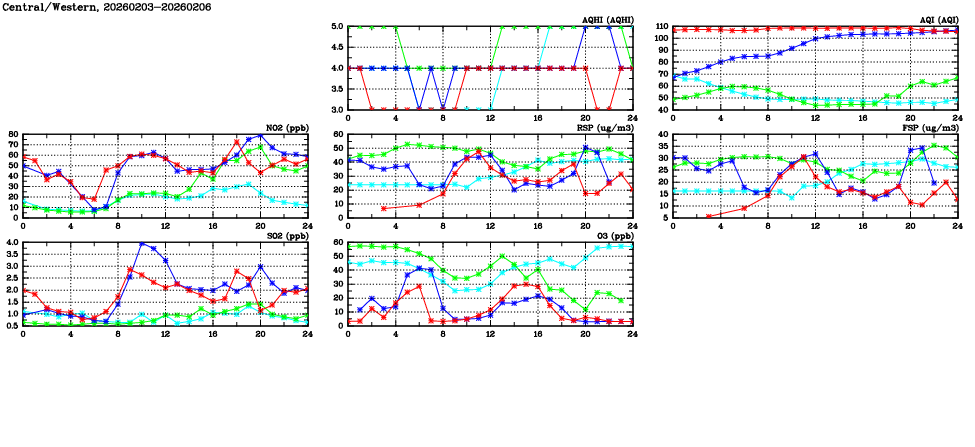 | Air Quality Data Time Series in Central/Western (2026/02/06) | ( Line colors: Day -3 Day -2 Day -1 Current day ) | 2D Map Current AQHI |