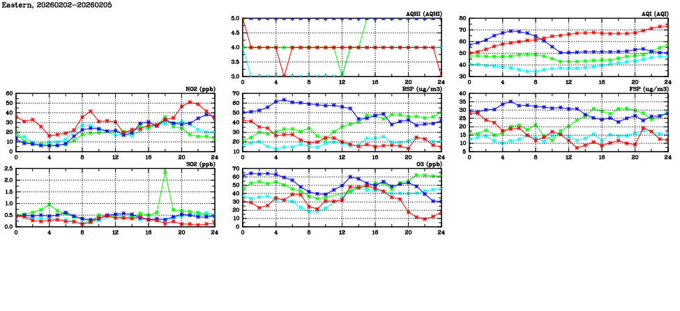 | Air Quality Data Time Series in Eastern (2026/02/05) | ( Line colors: Day -3 Day -2 Day -1 Current day ) | 2D Map Current AQHI |